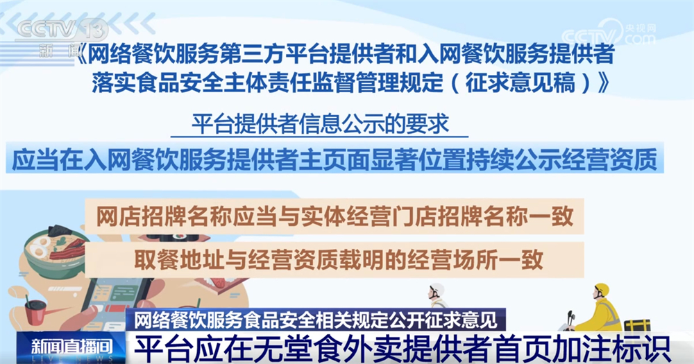 收罗看法稿明白平台供给者消息公示的要求,对于无堂食外卖供给者,为进一步加强收集餐饮办事食物平安监管。